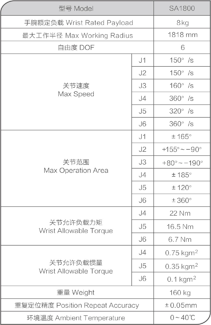 SA1800特性:手腕负载为8kg,可达半径为1818mm。