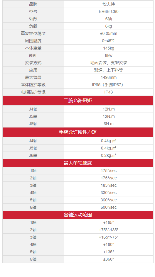 网站首页 > 产品展示 > 工业机器人 > 埃夫特ER6B-C60 6轴 负载6kg 工作域1433mm 弧焊/上下料 工业机器人 2023-05-27 机器人网 0 百度一下 2023-05-27 机器人网 0 百度一下 适合行业 工业机器人 发布作者 机器人网 最近更新 2023-05-27 18:18:25 概述: 文章详情 品牌名称Efort 联系我们: 埃夫特智能装备股份有限公司 ☉本站某些信息具有时效性,若有错误或已失效,需要更改请留言修改