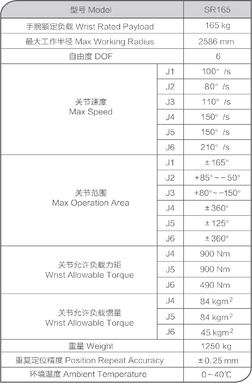 SR165特性:结构精简,有效负载为165kg,可达工作半径为2586mm,主要适用于大负载、大范围的工作场合。