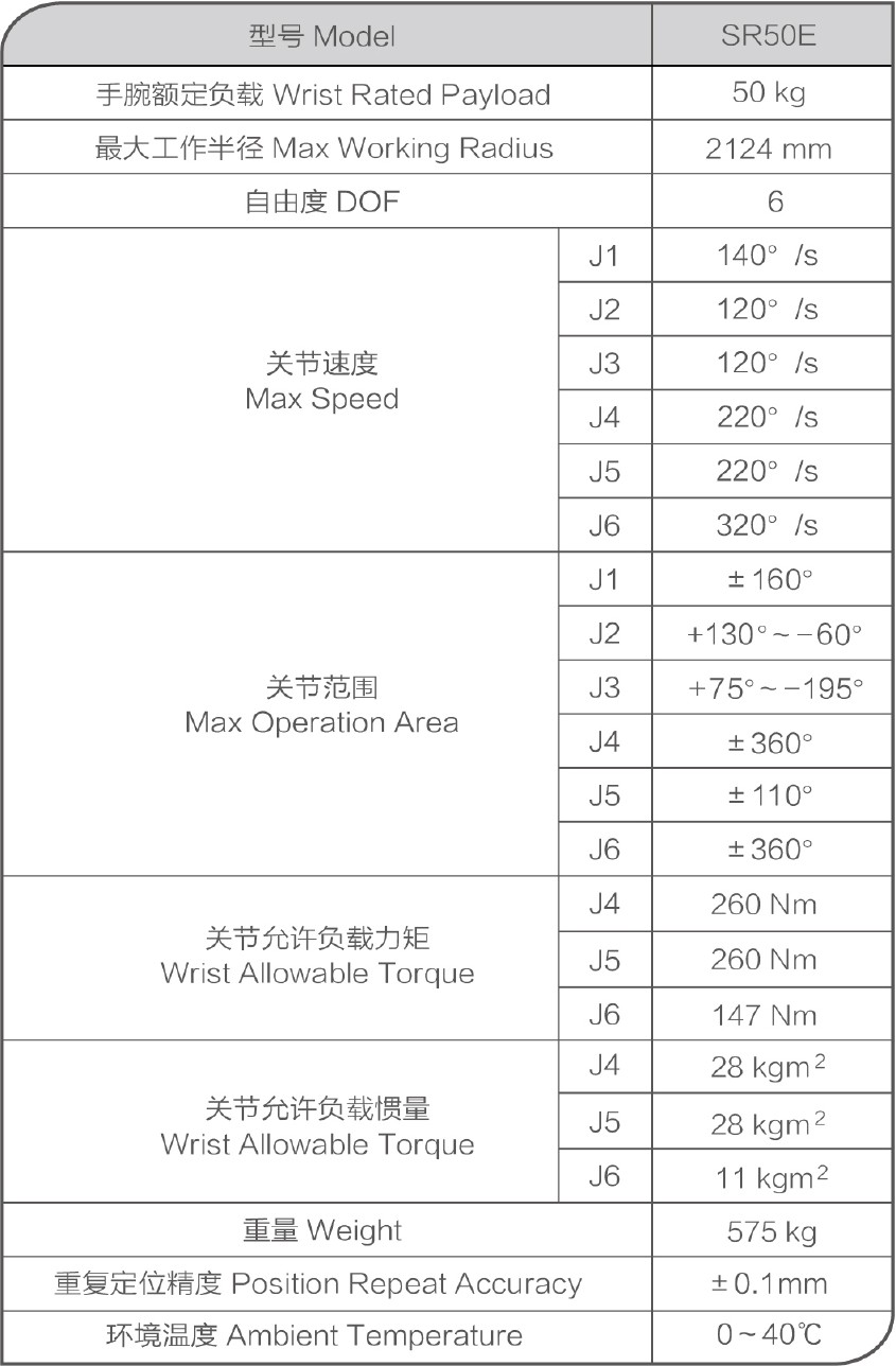 SR50E特性:结构轻巧,有效负载为50kg,可达工作半径为2124mm。主要适用于中等负载、大范围的工作场合。