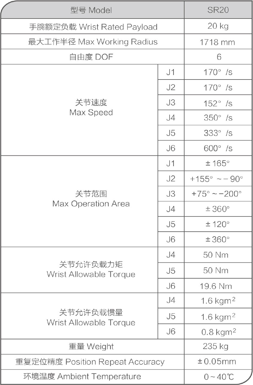 SR20特性:结构轻巧,有效负载为20kg,可达工作半径为1588mm,腕关节采用高精度谐波减速机。