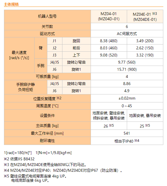 网站首页 > 产品展示 > 装配机器人 > 那智MZ04 6轴 负载4kg 工作域541mm 装配/上下料/搬运/包装 装配机器人 2023-05-27 机器人网 0 百度一下 2023-05-27 机器人网 0 百度一下 适合行业 装配机器人 发布作者 机器人网 最近更新 2023-05-27 18:18:37 概述: 文章详情 品牌名称Nachi 中空手腕的巧妙电缆排线通过中空结构的手腕*智能地对机械手电缆进行配线。通过简洁的穿插配线防止与周围的装置干扰,设备的可靠性大幅提高。紧凑,宽大的动作范围轻量紧凑型机械手使设备更加简单,为省空间化做出了贡献。MZ04进一步追求紧凑性。设置面积是MZ07的一半(A5纸大小)。最高级别的动作速度,提高生产率采用轻型机械手及最新的控制技术,实现了同级别最快的动作性能。提高了生产性。外形精炼平滑采用不容易积存尘埃,容易擦拭的设计。巧妙的电缆布线在中空手腕内抓手用的配线,配管可有序的收纳 联系我们: 不二越(中国)有限公司 ☉本站某些信息具有时效性,若有错误或已失效,需要更改请留言修改