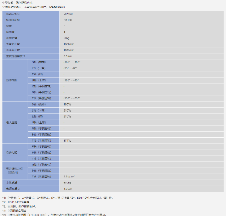 相关信息 LAIDER1000-M46 4轴 负载6kg 工作域1000mm 精度±0.05mm 搬运/包装/检测码垛机器人2023-05-27 18:44:59 迈德尔MDE1400-50 4轴 负载50kg 精度±0.08mm 码垛机器人2023-05-27 18:44:52 耐为ECR50-1850 4轴 负载50kg 精度±0.08mm 码垛机器人2023-05-27 18:43:23 耐为ECR20-1700 6轴 负载20kg 精度±0.06mm 码垛机器人2023-05-27 18:43:23 徳卡 DK120-2400-PL 4轴 负载120kg 精度±0.2mm 码垛机器人2023-05-27 18:28:18 耐为ECR5-1200标准 6轴 负载5kg 精度±0.06mm 码垛机器人2023-05-27 18:28:05