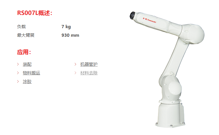网站首页 > 产品展示 > 装配机器人 > 川崎RS007L 6轴 负载7kg 工作域730mm 搬运/装配/涂胶 装配机器人 2023-05-27 机器人网 0 百度一下 2023-05-27 机器人网 0 百度一下 适合行业 装配机器人 发布作者 机器人网 最近更新 2023-05-27 18:18:47 概述: 文章详情 品牌名称Kawasaki RS007L机器人高速、高性能的行业机器人R系列机器人为所有小中型工业机器人设定了基准。紧凑的设计和杰出的速度、伸展距离和工作范围使R系列机器人适用于遍及众多不同行业的广泛应用范围。动作范围与尺寸点击下面的图片来查看。图中所示尺寸单位为毫米(mm)。 联系我们: 川崎机器人(天津)有限公司 ☉本站某些信息具有时效性,若有错误或已失效,需要更改请留言修改