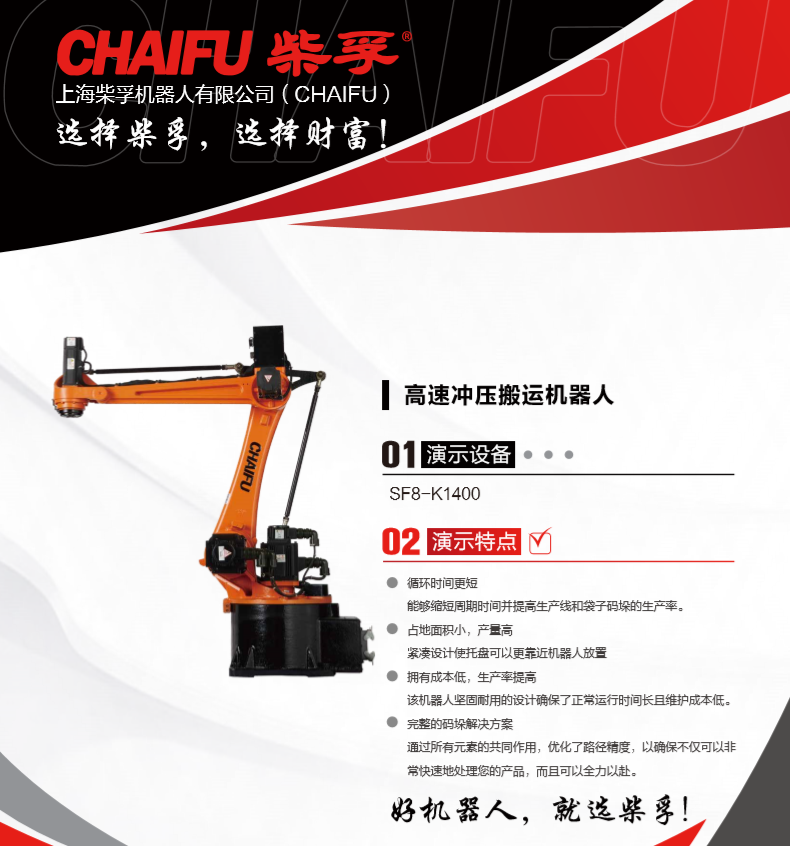 网站首页 > 产品展示 > 搬运机器人 > 柴孚 SF8-K1400 负载 8kg 工作区域 1492mm 高速冲压搬运机器人 2023-05-27 机器人网 0 百度一下 2023-05-27 机器人网 0 百度一下 适合行业 搬运机器人 发布作者 机器人网 最近更新 2023-05-27 18:19:01 概述: 文章详情 品牌名称CHAIFU 联系我们: 上海柴孚机器人有限公司 ☉本站某些信息具有时效性,若有错误或已失效,需要更改请留言修改