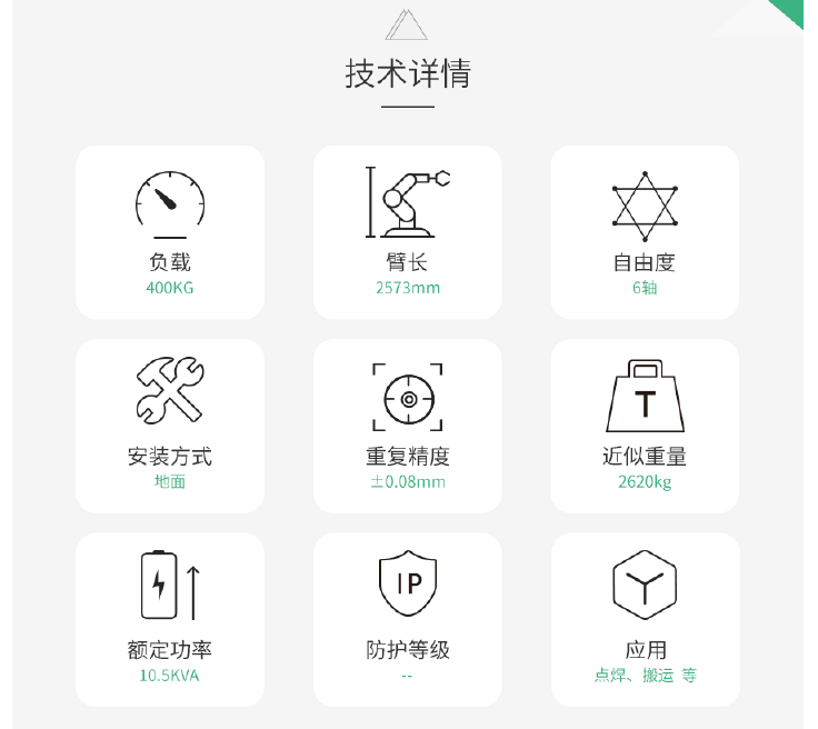 相关信息 锐曼拖地机器人(蜗牛洁霸)2023-05-27 18:44:53 欧铠复合机器人 激光SLAM导航 负载500kg 精度±10mm 复合机器人2023-05-27 18:43:31 智亿 06A-090 6轴 负载6kg 精度±0.08mm 搬运、上下料通用机器人2023-05-27 18:43:29 巨轮 JLRB300 6轴 负载300kg 精度±0.3mm 焊接、码垛通用机器人2023-05-27 18:43:26 卓林 CR5-1500 6轴 负载5kg 精度±0.05mm 搬运、码垛、上下料、焊接通用机器人2023-05-27 18:43:25 卓林 CR25-1900 6轴 负载25kg 精度±0.05mm 搬运、码垛、上下料、焊接通用机器人2023-05-27 18:43:25