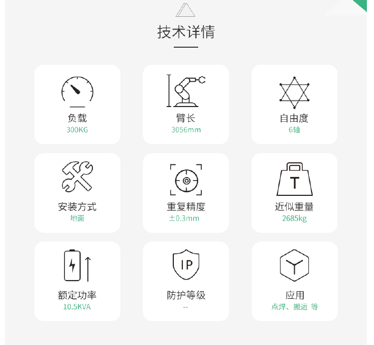 相关信息 锐曼拖地机器人(蜗牛洁霸)2023-05-27 18:44:53 欧铠复合机器人 激光SLAM导航 负载500kg 精度±10mm 复合机器人2023-05-27 18:43:31 智亿 06A-090 6轴 负载6kg 精度±0.08mm 搬运、上下料通用机器人2023-05-27 18:43:29 巨轮 JLRB300 6轴 负载300kg 精度±0.3mm 焊接、码垛通用机器人2023-05-27 18:43:26 卓林 CR5-1500 6轴 负载5kg 精度±0.05mm 搬运、码垛、上下料、焊接通用机器人2023-05-27 18:43:25 卓林 CR25-1900 6轴 负载25kg 精度±0.05mm 搬运、码垛、上下料、焊接通用机器人2023-05-27 18:43:25