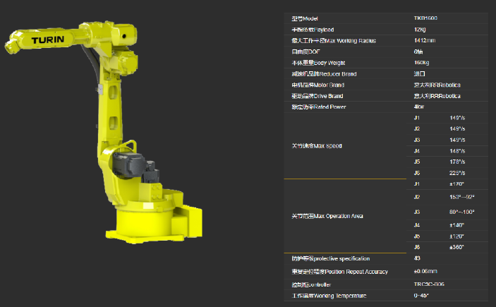 该机器人的核心部件全部采用进口品牌(减速机:1/2/3轴,日本纳博特斯克;4/5/6轴日本新宝。伺服驱动:韩国LS。驱动电机:1/2/3轴,韩国LS;4/5/6轴,日本多摩川),且采用最先进的EtherCAT总线技术,具有速度快,精度高,稳定性好,可长时间24小时连续作业。TKB1600型机器人可应用于几乎所有的典型工业应用,包括:焊接、喷涂、打磨(抛光类)、机床上下料、分拣等。