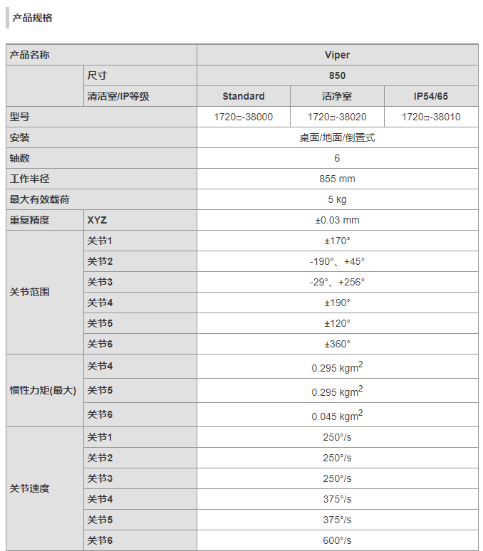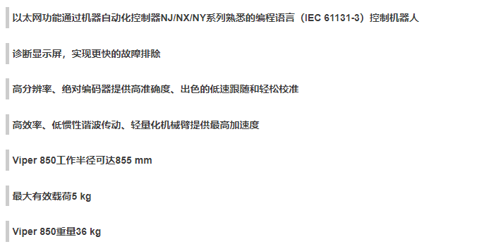 网站首页 > 产品展示 > 工业机器人 > 欧姆龙Viper 850 6轴 负载5kg工作域653mm 上下料,装配通用机器人 2023-05-27 机器人网 0 百度一下 2023-05-27 机器人网 0 百度一下 适合行业 工业机器人 发布作者 机器人网 最近更新 2023-05-27 18:19:57 概述: 文章详情 品牌名称OMRON 联系我们: 欧姆龙自动化(中国)有限公司 ☉本站某些信息具有时效性,若有错误或已失效,需要更改请留言修改