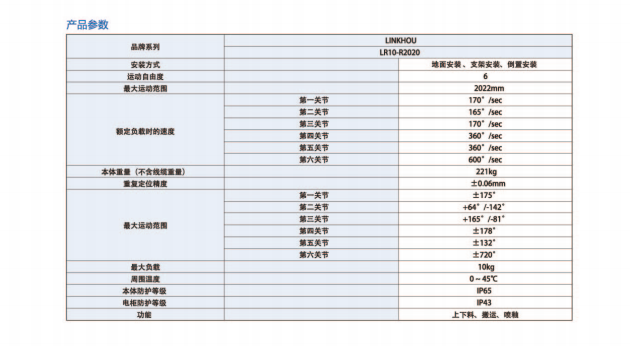 网站首页 > 产品展示 > 工业机器人 > 灵猴LR10-R2020 6轴 负载10kg工作域2022mm 下料,搬运,喷涂 多功能机器人 2023-05-27 机器人网 0 百度一下 2023-05-27 机器人网 0 百度一下 适合行业 工业机器人 发布作者 机器人网 最近更新 2023-05-27 18:20:14 概述: 文章详情 品牌名称LiNKHOU 联系我们: 苏州灵猴机器人有限公司 ☉本站某些信息具有时效性,若有错误或已失效,需要更改请留言修改