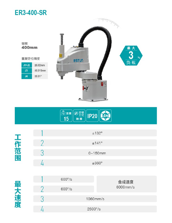 轴数4轴 | 工作域400mm | 负载3kg |