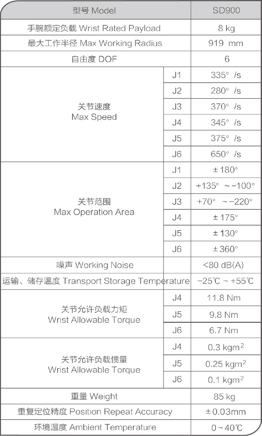 全新SD900机器人是SD系列桌面型工业机器人,拥有体积小、重量轻的优势。机型采用轻量式手臂设计,机械臂稳健、牢靠,负载可达8kg。机器人机械结构紧凑、简洁、灵活、轻盈,手臂臂展,同时还具备极高的重复定位精度,重复定位精度达±0.03mm,性能稳定可靠,高速的运动关节,大幅优化运行空间,使其能在狭小工作空间内进行灵活地作业,短期内即可收益,满足柔性化生产。防护等级高达IP67,可以适应恶劣的生产环境。该系列专为打磨、搬运、装配等低负载的工艺工作制定,特别适用于需求高度重复性、高精度的工艺应用场合。