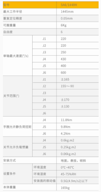 SA6/1440特性:手腕负载为6Kg,最大半径为1445mm。