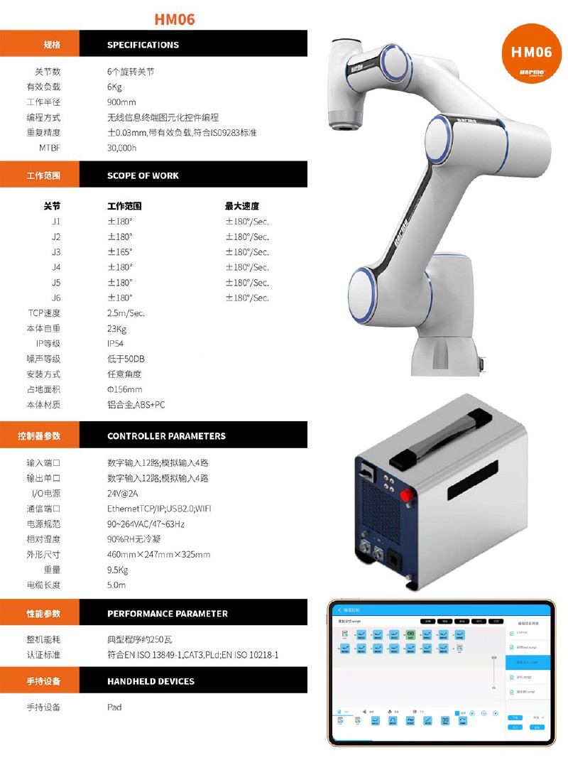 HM06六轴协作机器人可以自动处理重达6公斤以上的任务并且不会降低精确度。