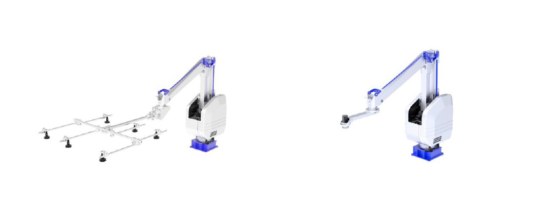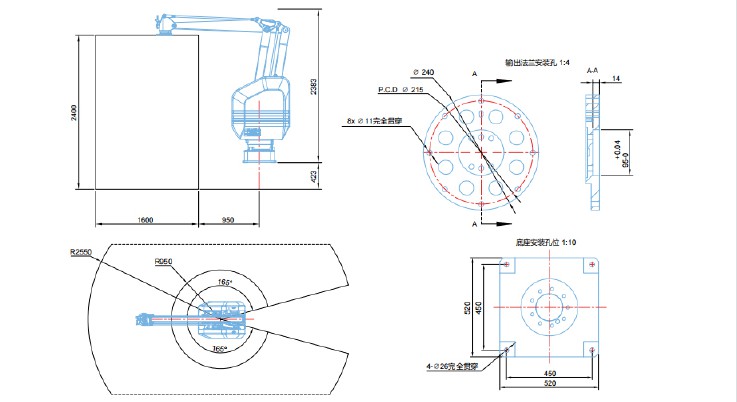 四轴、SAR130-2550-2400,可选装五六轴 ★ 相对SAR120-2450-2300,本机型速度更快并且行程略大 ★ 标准色:主副臂/灰白色,护罩/白色,连杆/蓝色,基座/蓝色