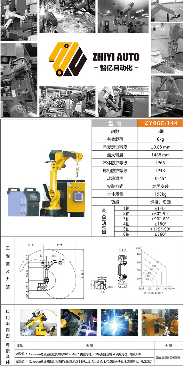 六轴机器人有效载荷6kg,重复定位精度±0.08mm,最大臂展1488mm,安装方式地面安装。