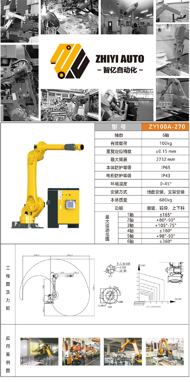 六轴机器人有效载荷100kg,重复定位精度±0.15 mm,最大臂展2732 mm,安装方式地面安装,支架安装。
