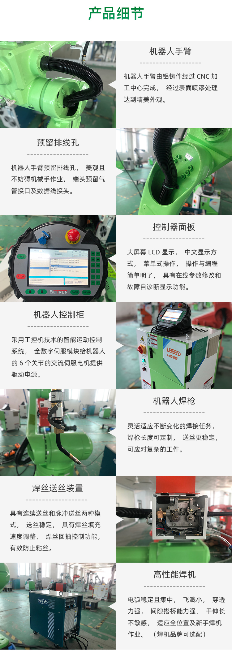 采用行业一流核心配件(意大利合资减速机,日本多摩川23位绝对值光电编码器伺服电机,德国易格斯高柔电缆,法国施耐德电器配件),标配5个预约盒接口、送丝机保护罩、超大电流焊枪接线端子,标配3个外部轴,另可选配5个外部轴,实现11轴联动;