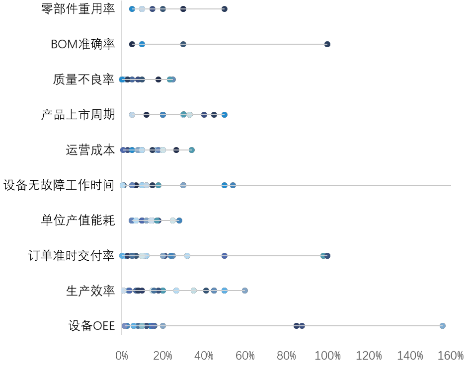 50家工业数字化转型领航企业经过长期深入的数字化实践,实现了效率和效益的双提升。数据显示,入围企业呈现出的量化指标有161个,这些指标是数字化转型给企业带来的实质性成效。其中数字化转型的推进普遍给企业设备OEE、生产效率、订单准时交付率、单位产值能耗等KPI带来了提升。