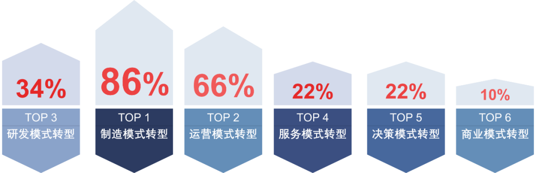 就50家领航企业的转型模式选择上看,86%的企业将重点放在“制造模式转型”的推进并取得较好的转型成效。此外,66%的企业入围了“运营模式转型”奖项,其次是研发模式转型、服务模式转型、决策模式转型和商业模式转型,占比分别为34%、22%、22%和10%。