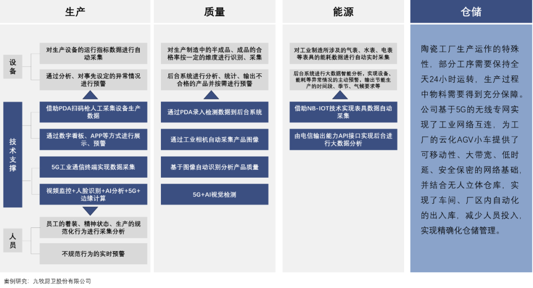 ◉ 制造模式转型方面,领航企业扎根制造,围绕生产相关的业务,以指标、流程、数据为核心,以信息系统为支撑,提升生产过程的运行水平和运行能力。典型应用涉及工艺、计划、生产、物流、质量、安环等多个方面,中信戴卡已经构建柔性制造系统,实现了零切换时间的混线生产、多批量定制化生产;延锋彼欧利用VR进行远程设备维修、工艺调试,利用数字孪生技术实现生产过程监控与工艺优化;广东联塑、菲尼克斯等通过智能化物流体系建设,结合AGV、立库等硬件设施及3D物流仿真、物联网等技术的应用,实现全物流信息的实时管控;美的集团、联宝电子、一汽-大众、横店东磁、道道全等结合AI、大数据实现数字化质量检测、分析和控制;九牧厨卫通过5G+AI赋能人员安全监控与预警等等。领航企业竭力推动IT与OT的深入融合,探索并不断拓展先进制造技术、新一代信息技术在企业的应用广度与深度,推动企业制造模式变革。