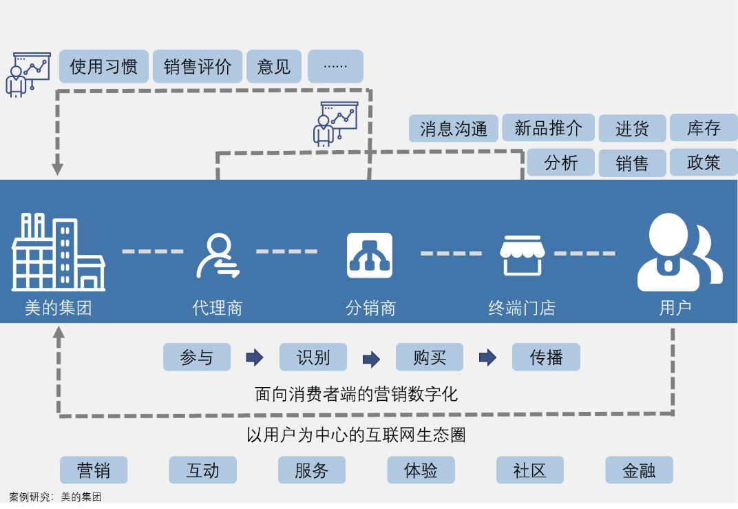 ◉ 运营模式转型方面,更敏捷的运营是企业数字化转型的主要目标之一,通过数字化技术的应用可以提升大多数流程执行的效率,降低成本,帮助企业实现更精细化的管理,同时不断改善用户体验。例如美的集团通过“美云销”建立了以用户为核心的数字化营销与运营模式;维达应用大数据赋能销售预测和产能分析;中航电测通过构建“架构-流程-IT”一体化运营管理体系实现全流程管控;爱柯迪利用大数据分析平台打通业务运营系统,实现全流程数据连通等等。另外,三一集团应用人脸识别技术实现智能考勤,菲尼克斯采用AI智能面试,厦门宏发电声通过多维度数据洞察分析挖掘销售机会,华润三九基于区块链技术支撑的全产业链溯源应用等都能在运营层面帮助企业提升效益与效能。