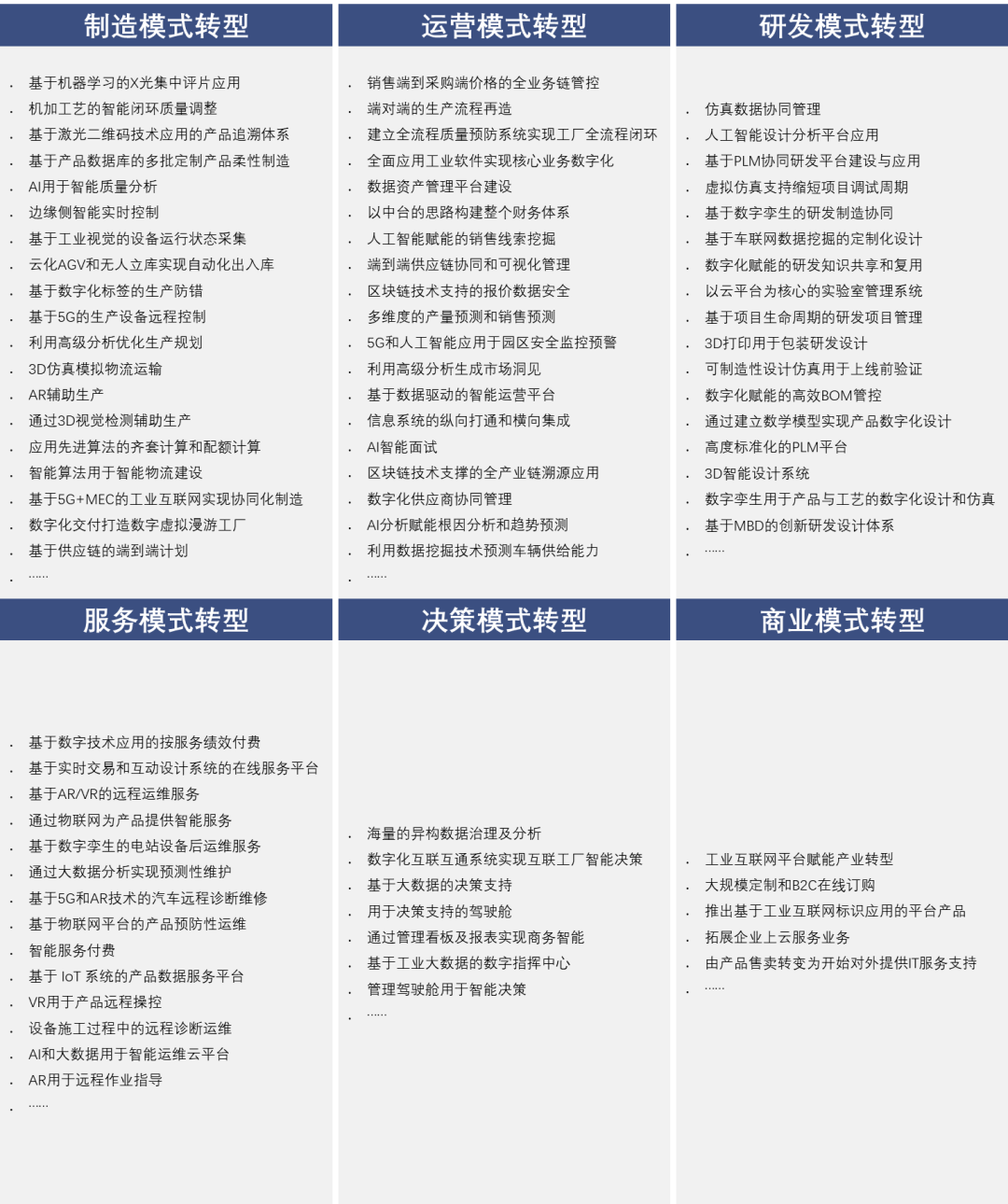 企业组织、业务、产品和价值链的复杂性,为工业企业的数字化转型带来诸多障碍。事实上,数字化转型并非单项技术的应用,也不仅仅是个技术命题,更是一个战略和管理命题。因此,企业需要深度剖析数字化转型的需求和突破口,确定明确的数字化转型方向。经过多年对工业企业数字化转型进程及转型路径的深度剖析,提出了工业企业数字化转型6大典型路径,即:商业模式转型、研发模式转型、制造模式转型、服务模式转型、运营模式转型和决策模式转型。