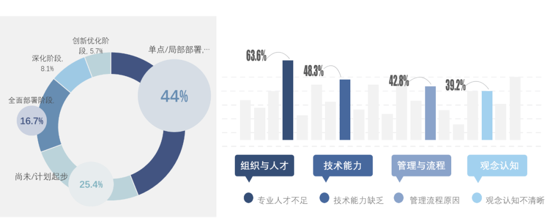 根据对工业企业数字化转型动因分析发现,企业战略发展要求是数字化转型的首要动因,其次是行业发展趋势驱使、经济下行压力驱动等因素。这也充分说明,越来越多的企业着眼于企业自身的发展,迫切希望引入新模式、新业态、新技术,进一步催化了数字化转型的推进进程。然而,能进入深化或创新阶段的企业不足14%,仍有25.4%的企业处于尚未或计划起步阶段,还没有迈向数字化之路。究其原因,组织与人才、技术能力和管理成为了转型路上的三把利剑,制约了企业转型的步伐。