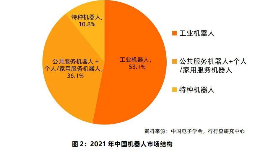根据中国电子学会发布的《中国机器人产业发展报告(2021年)》(以下简称《报告》)显示,2021年我国机器人市场规模预计达到839亿元,其中工业机器人市场规模约为445.7亿元,占比为53.1%;服务机器人市场规模约为393.3亿元,占比为46.9%。而在服务机器人市场中,公共服务机器人及个人/家用服务机器人的市场规模预计达302.6亿元,占总市场规模的36.1%;特种机器人市场规模约为90.7亿元,占总市场规模的10.8%。