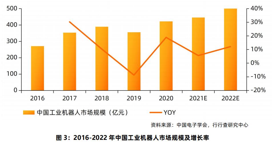 《报告》公布的数据显示,我国工业机器人市场规模近五年的年均复合增速超过12%,现已成为全球第一大工业机器人应用市场。而据国家统计局公布的数据显示,继2020年全国工业机器人产量突破20万套大关后,2021年全国工业机器人产量成功突破30万套大关,达到36.6万套,同比增长44.9%,创历史新纪录。伴随着国内工业制造领域的生产智能化改造和数字化升级的浪潮,工业机器人将继续保持乐观的发展前景,预计2022年我国工业机器人市场规模将迫近500亿元。