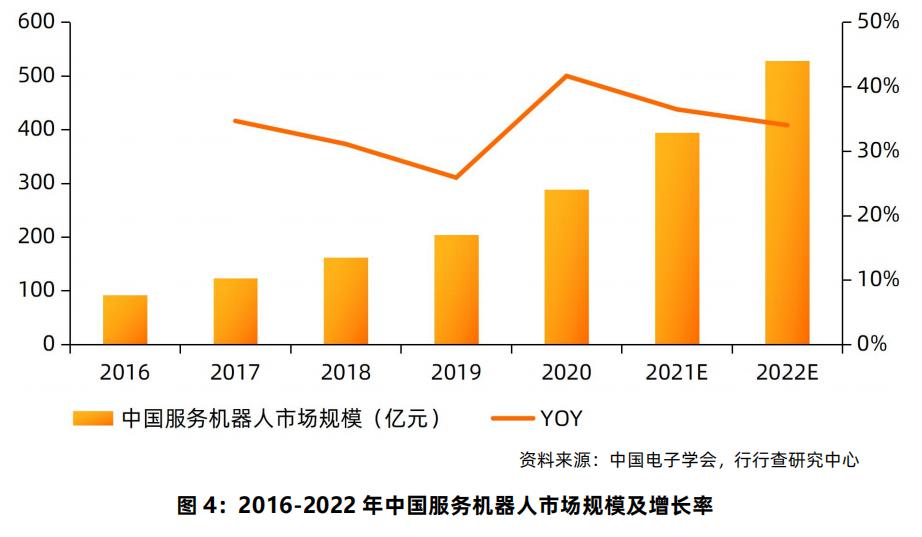 2021年我国服务机器人市场规模预计达到393.3亿元,2016-2021年的年均复合增速达34%,市场规模总体增速高于工业机器人。近年来,服务型机器人产品的消费需求不断升级、消费群体日益扩大,C端市场应用渗透率不断提升,预计2022年我国服务机器人的市场规模将达到500-550亿元。