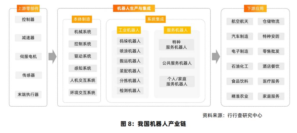 机器人产业链主要分为上游核心零部件研发与生产、中游本体制造和系统集成,以及下游各行各业的具体应用等三方面: