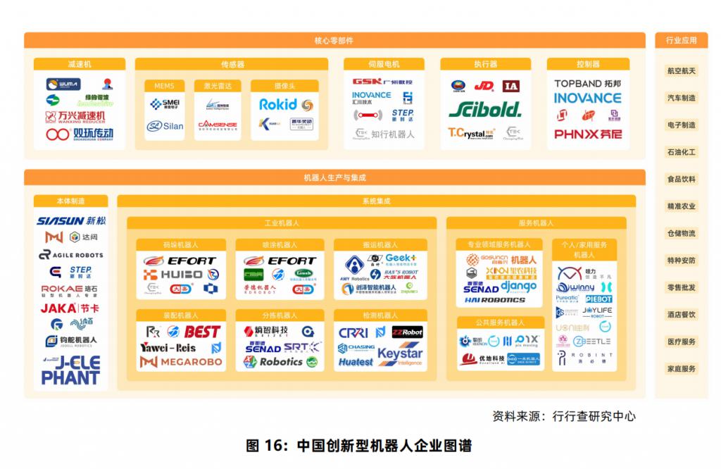 中游本体制造和系统集成:涵盖机器人本体制造商以及面向应用部署服务的系统集成商。其中,本体制造商在机器人本体结构设计和加工制造的基础上,通过集成上游零部件实现机器人整机的生产;系统集成商则成为连接生产企业和客户的桥梁,通过面向具体用户需求的定制化集成开发,实现机器人在特定场景中的实际布署。