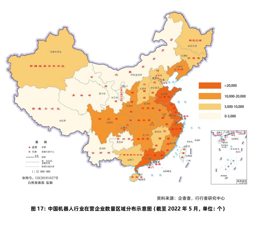 从企业数量的地域分布情况来看,我国机器人企业主要集中在广东、江苏、浙江、山东、上海等经济发达地区。根据企查查数据统计显示,我国34个省级行政区中,拥有0-3000家机器人企业的省级行政区有10个,3000-10000家机器人企业的省级行政区有10个,10000-20000家机器人企业的省级行政区有9个,拥有超20000家机器人企业的省级行政区分别是上海、浙江、山东、江苏以及广东。