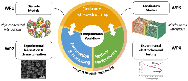 Alejandro A. Franco主导建设了一个名为“ARTISTIC”的项目,该项目受到欧盟地平线2020科研计划的资助。该项目团队建立了一个模拟锂离子电池制造过程并预测其电化学性能的计算平台。该技术平台通过离散元法和粗粒化分子动力学(coarse grained molecular dynamics)模型基于工艺参数预测电极介观结构,再基于连续介质模型利用介观结构数据预测电池宏观上的电化学性能表现。可以看出该项目在尝试建立一个材料-工艺-(极片)结构-性能的多尺度仿真平台。