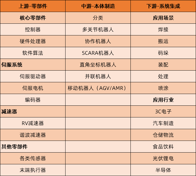 工业机器人产业链上游是零部件,包括核心零部件和其它零部件;中游是本体制造,按照机械结构和运动方式的不同,可分为多种类型;下游是机器人系统集成,应用于不同行业场景。