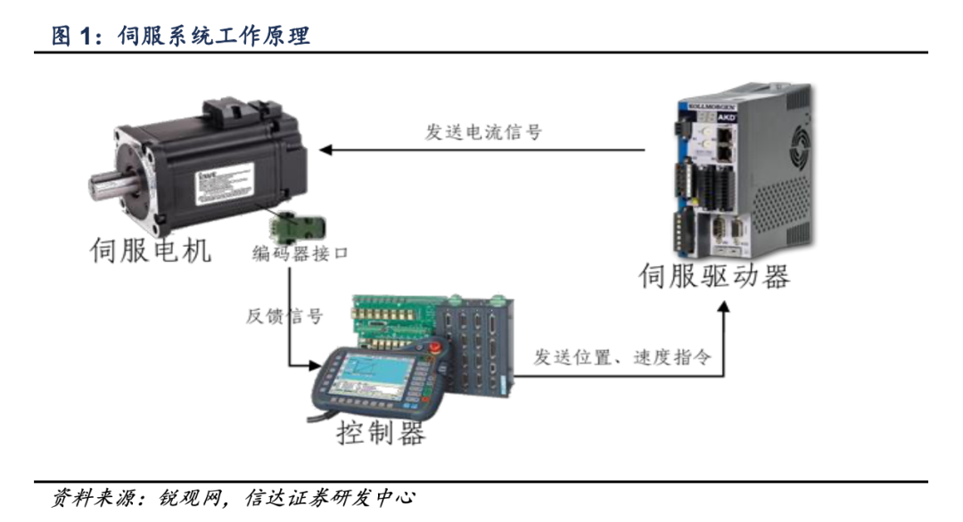 伺服系统由伺服驱动器、伺服电机、编码器三部分组成。伺服驱动器将从控制器接收到的信息分解为单个自由度系统能够执行的命令,传递给伺服电机;伺服电机再将收到的电信号转化为转速和转矩,驱动控制对象;编码器将电机的编码信号反馈给控制器,很大程度上决定了伺服系统的精度。