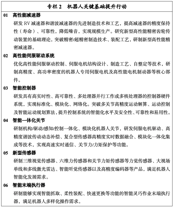 《“十四五”机器人产业发展规划》文件中,对产业发展提出的规划是:到2025年,我国成为全球机器人技术创新策源地、高端制造集聚地和集成应用新高地。一批机器人核心技术和高端产品取得突破,整机综合指标达到国际先进水平,关键零部件性能和可靠性达到国际同类产品水平。