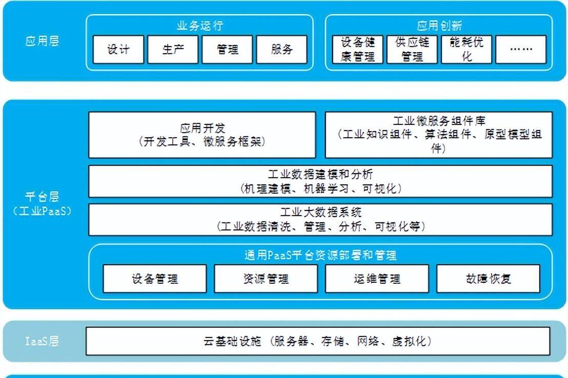 工业互联网平台的核心是平台。传统的工业生产中,通常是人基于感知到的信息,通过数学原理、物理约束、历史经验等总结、推理,最终形成一系列的决策规则和方法,用来指导生产过程。而进入物联网时代以来,极大的扩展了生产要素分布的层次和广度,生产要素之间的联系纷繁复杂,难以用简单的数学或者物理模型进行描述,而对于新模式的生产场景和个性化的生产需求,难以显性、直接地从历史经验中总结出决策规则,因此,工业互联网平台的核心是利用大数据、人工智能等方法,从海量高维、互联互通的工业数据中,挖掘出隐藏的决策规则,从而指导生产。工业互联网平台在通用PaaS架构上进行二次开发,实现工业PaaS层的构建,为工业用户提供海量工业数据的管理和分析服务,并能够积累沉淀不同行业。不同领域内技术、知识、经验等资源,实现封装、固化和复用,在开放的开发环境中以工业微服务的形式提供给开发者,快速构建定制化工业APP,打造完整、开放的工业操作系统。