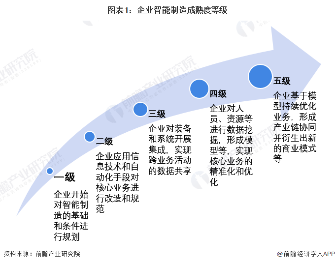 2021 年5 月,《智能制造能力成熟度模型》(GB/T 39116-2020)发布,该标准将智能制造能力定义为:为实现智能制造的目标,企业对人员、技术、资源、制造等进行管理提升和综合应用的程度。并且提出了企业智能制造成熟度的5个等级,分别为一级(规划级)、二级(规范级)、三级(集成级)、四级(优化级)、五级(引领级)。