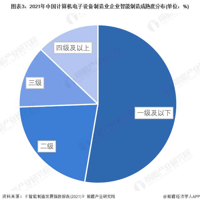 根据《智能制造发展指数报告(2021)》统计数据,2021年中国计算机电子设备制造业智能制造成熟度在一级及以下的企业占比为52.7%,二级企业占比超过20%,三级和四级及以上企业占比均超过12%,位于各行业智能制造能力成熟度水平前列。