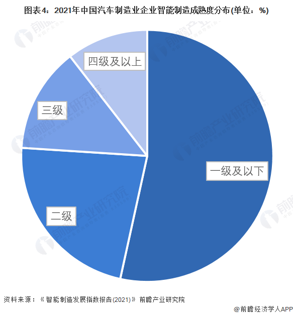 根据《智能制造发展指数报告(2021)》统计数据,2021年中国汽车制造业智能制造能力水平达到二级及以上的企业数量占比超过46%,其中四级及以上企业占比超10%。