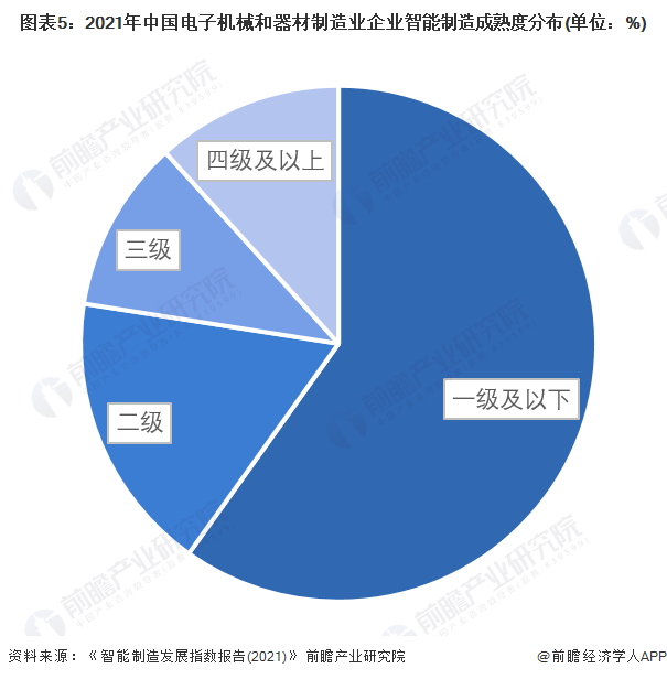 根据《智能制造发展指数报告(2021)》统计数据,2021年中国电子机械和器材制造业智能制造能力水平达到二级及以上的企业数量占比超过40%,其中四级及以上企业占比超11%。