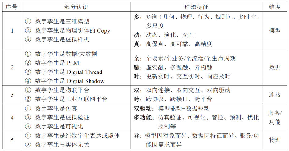 综上所述,当前对数字孪生存在多种不同认识和理解,目前尚未形成统一共识的定义,但物理实体、虚拟模型、数据、连接、服务是数字孪生的核心要素。