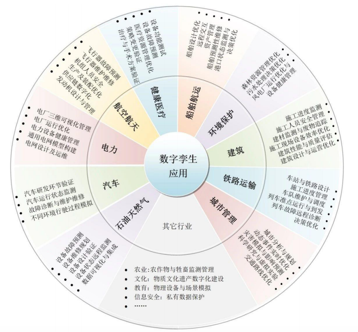 当前数字孪生已得到了十多个行业关注并开展了应用实践。除在制造领域被关注和应用外,近年来数字孪生还被应用于电力、医疗健康、城市管理、铁路运输、环境保护、汽车、船舶、建筑等领域,并展现出巨大的应用潜力。