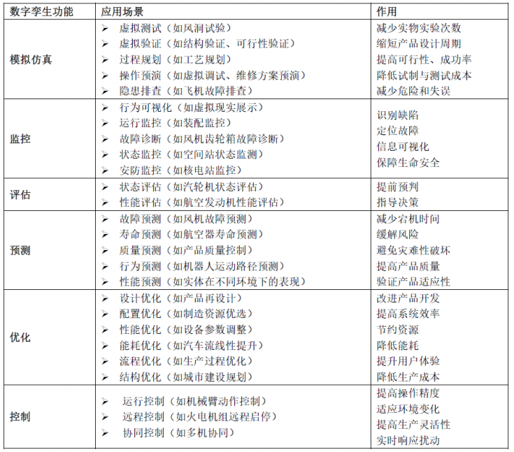数字孪生正在成为提高质量、增加效率、降低成本、减少损失、保障安全、节能减排的关键技术,同时数字孪生应用场景正逐步延伸拓展到更多和更宽广的领域。数字孪生具体功能、应用场景及作用如下表所示。